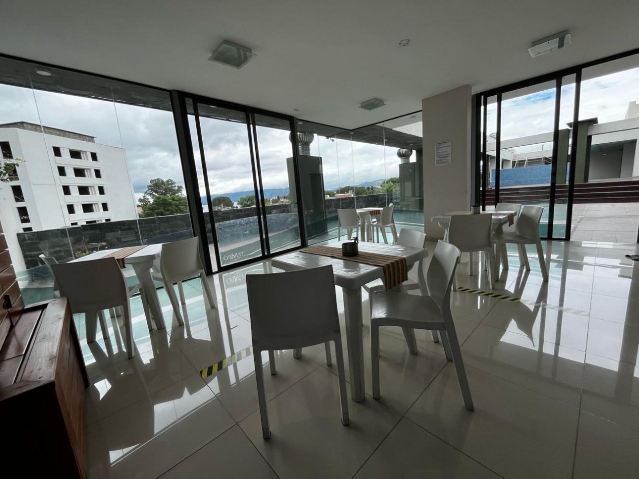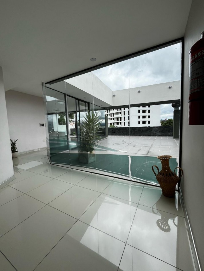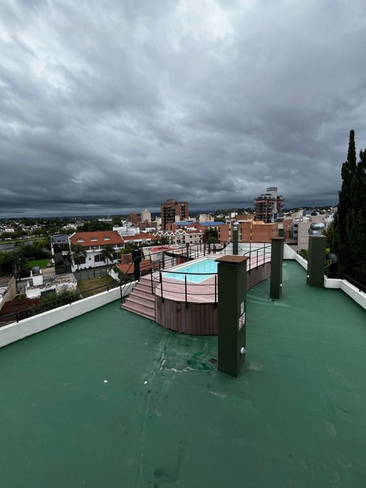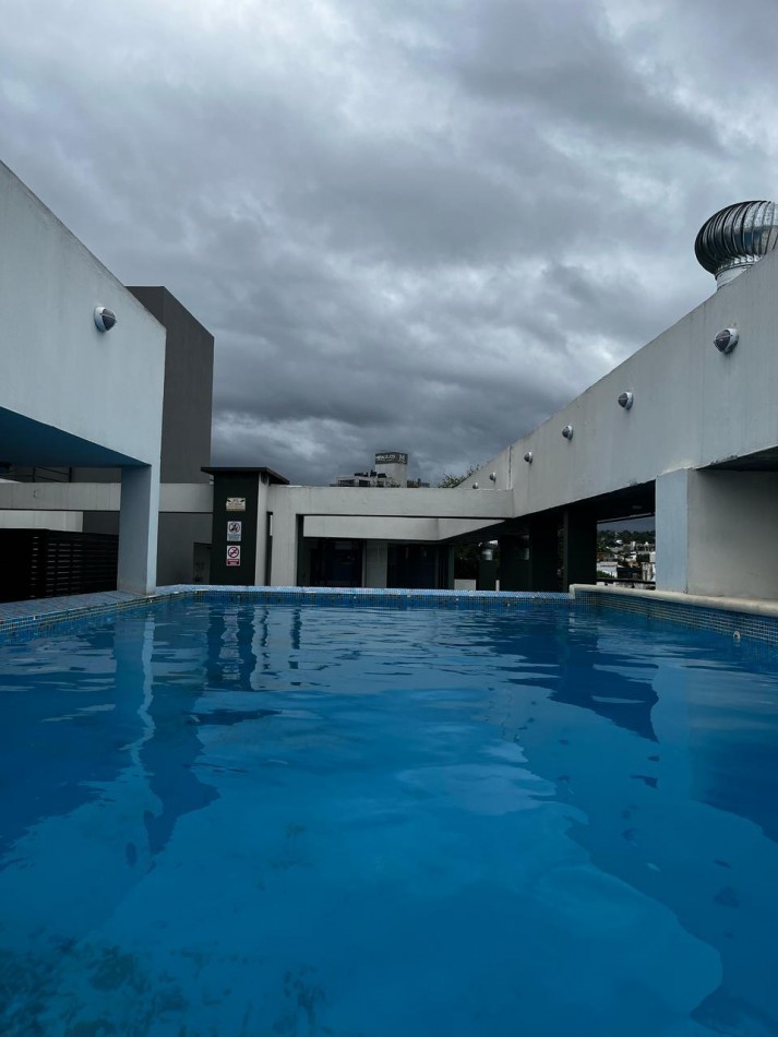 Edificio con amenities como ascensor, pileta, SUM y terraza con asadores.